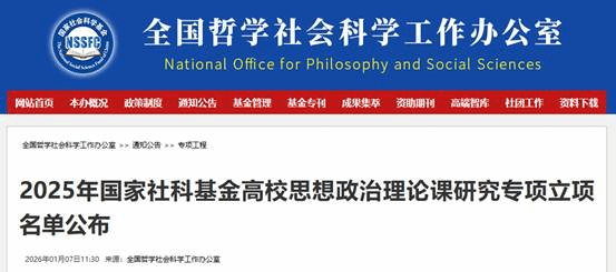国家社科基金高校思想政治理论课研究专项是全国思政课研究领域层次最高、权威性最强的科研项目之一,是衡量高校思政教育科研实力的重要标志。该项目是贯彻落实习近平文化思想和习近平总书记关于学校思政课建设的重要指示以及新时代学校思政课建设推进会部署的重要举措,对于深入探索思政课建设和教学基本规律与重大问题,推动思政课建设内涵式发展具有重要意义。