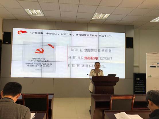 随后,李娇娇老师就《制度治党:全面从严治党的重要保障》这一专题的教学目的与要求、重点难点进行了说明。李娇娇老师从“中央八项规定”出台背景及主要内容开始引出该次讲授的主题即制度建党,她分别从制度治党的重要性、如何贯彻党的制度建设及如何完善党的制度建设三个方面对专题进行了系统地讲解,并重点讲解了中国共产党制定出台的若干党规、条例。在讲解过程中,李老师以故事和案例的形式深入浅出地将我党在建章立制、从严治党方面取得成绩进行概括归纳。李老师的讲课得到了大家的高度认可,大家认为李老师讲课思路清晰,逻辑严谨,重点突出。